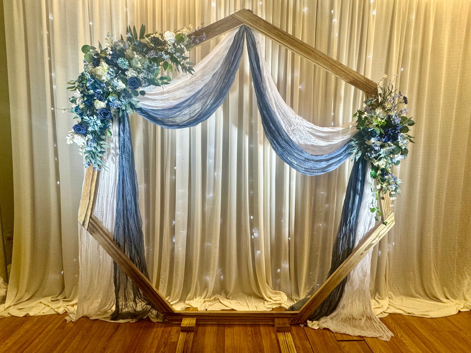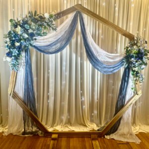 Heptagon Wood Arch Set Only (87″W x 87″H): Heptagon wood arch + 2 flower arrangements + chiffon drape
