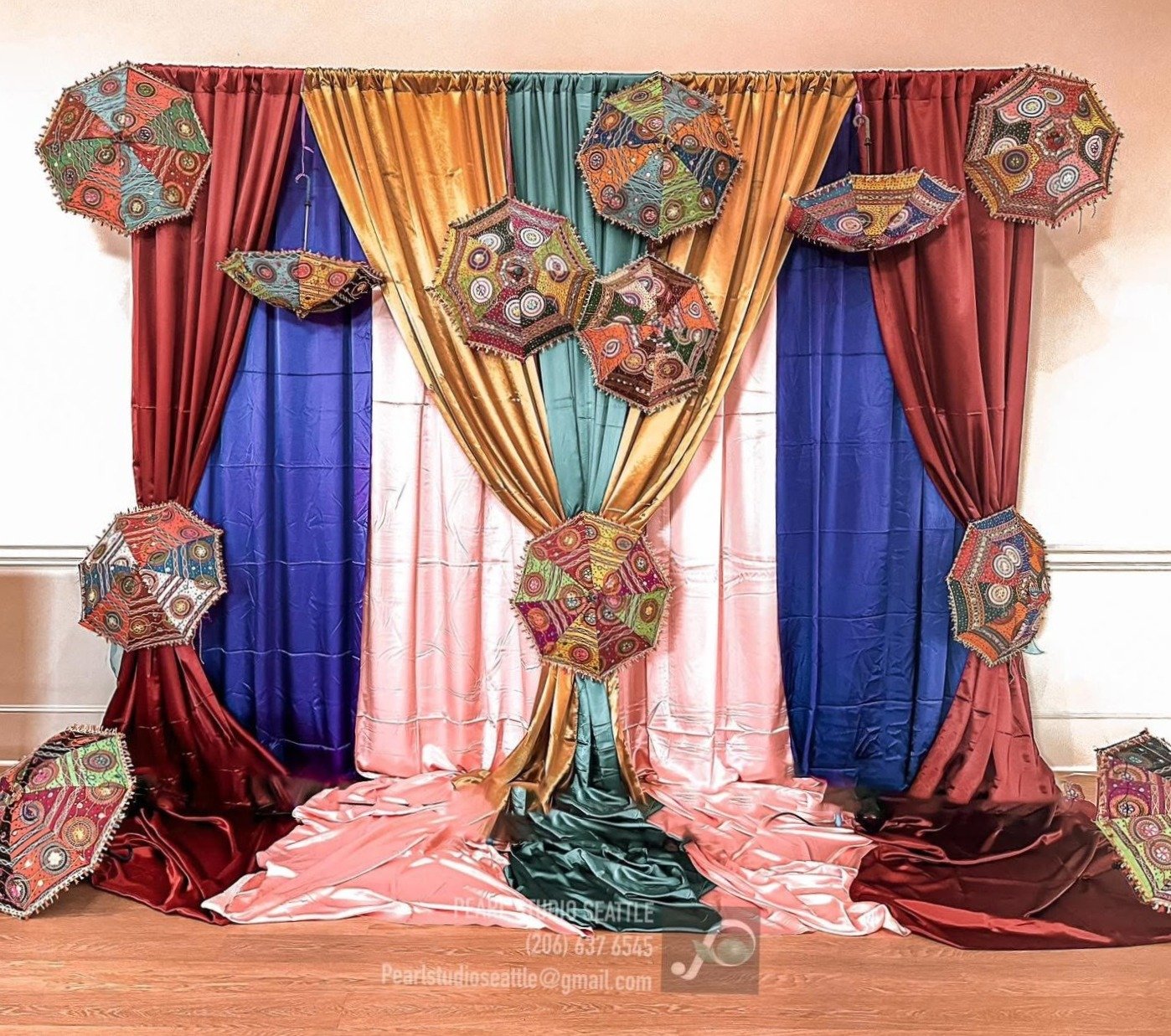Indian theme backdrop includes 1 double rod frame + 9 panels of satin drape + umbrellas
